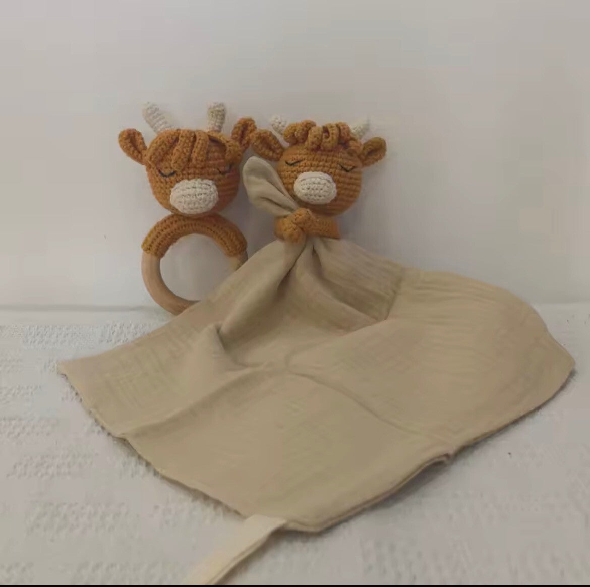 Knuffeldoekje is gemaakt van zachte hydrofielstof en gehaakte katoen. De bijtring is gemaakt van een houten ring en gehaakte katoen. Hiermee kan je kindje heerlijk kroelen en knuffelen.