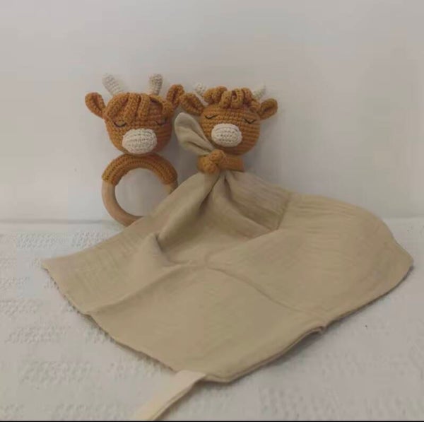 Knuffeldoekje met rammelaar - Highland Cow - Geborduurd met naam of tekst