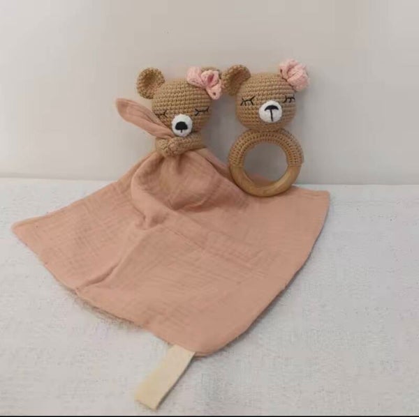 Knuffeldoekje is gemaakt van zachte hydrofielstof en gehaakte katoen. De bijtring is gemaakt van een houten ring en gehaakte katoen. Hiermee kan je kindje heerlijk kroelen en knuffelen.