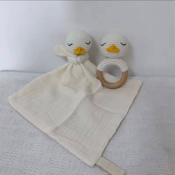 Knuffeldoekje is gemaakt van zachte hydrofielstof en gehaakte katoen. De bijtring is gemaakt van een houten ring en gehaakte katoen. Hiermee kan je kindje heerlijk kroelen en knuffelen.